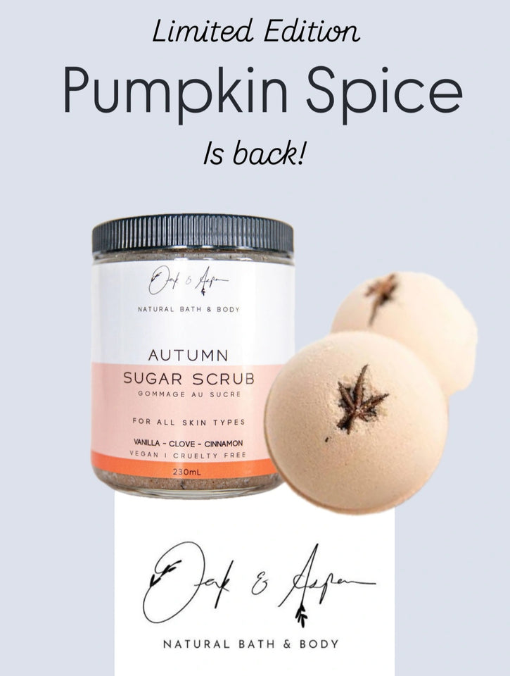 Extend your obsession to your bath this fall with our Pumpkin Spice Bath Bomb OR Autumn Sugar Scrub made locally in Ardrossan, AB.